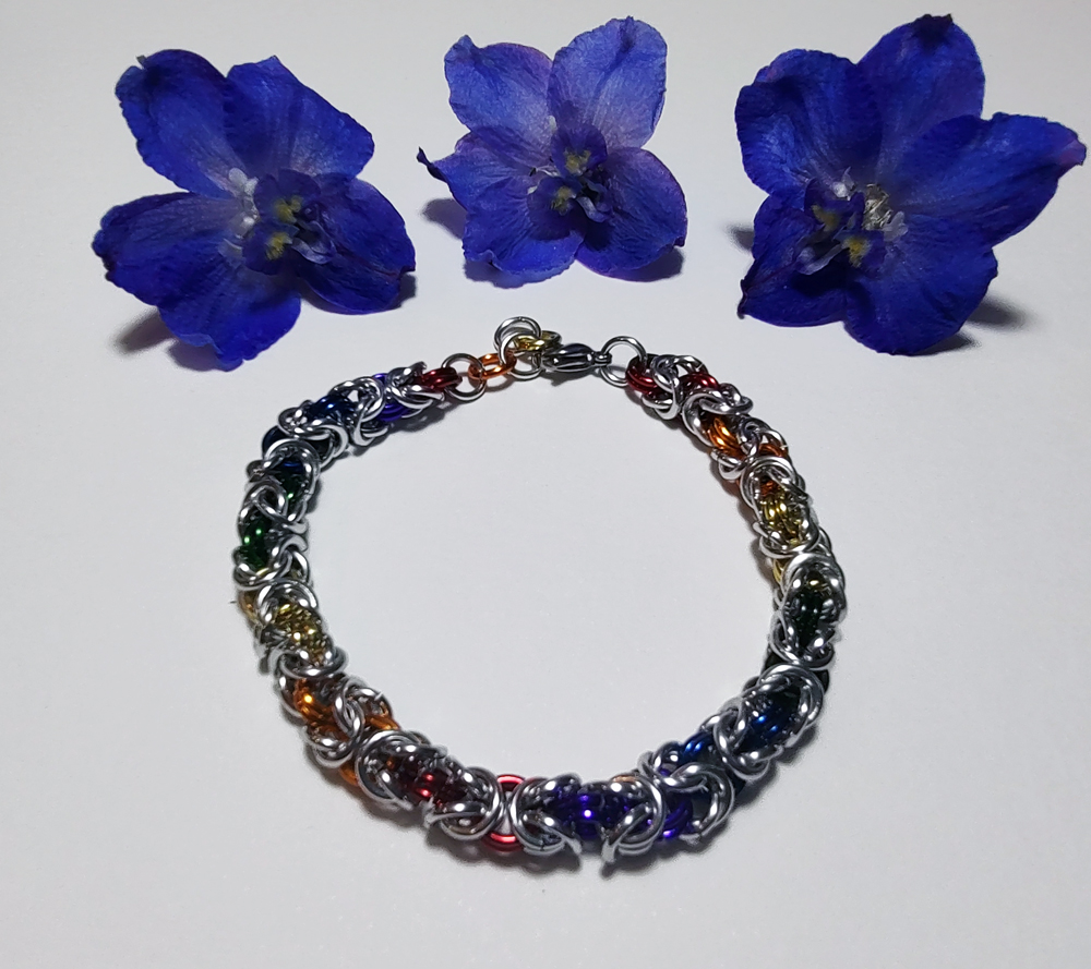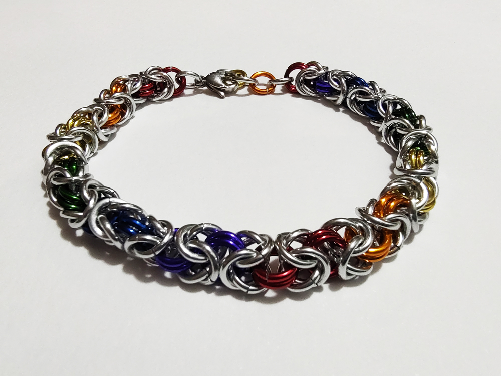 This bracelet is handmade in the byzantine weave. I made it using anodized aluminum so it is very lightweight and will not tarnish. Silver and rainbow (red, orange, yellow, green, blue, purple). You can select your wrist size from the menu. Lobster clasp. I can make this bracelet in other colors as well, feel free to message me and see what colors are available :)
