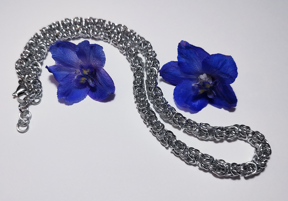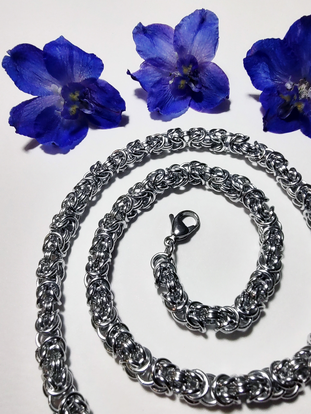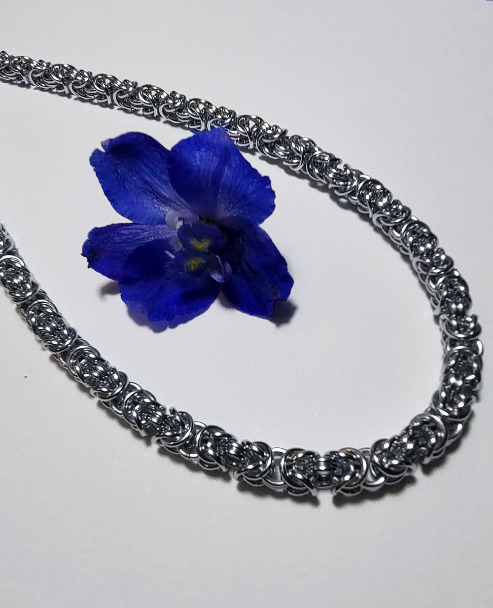 This handmade necklace is made in the byzantine weave. I made it out of anodized aluminum so it will not tarnish and is incredibly lightweight. Nickle free. Lobster clasp. 2 inch extender chain. Choose your preferred length from the menu.