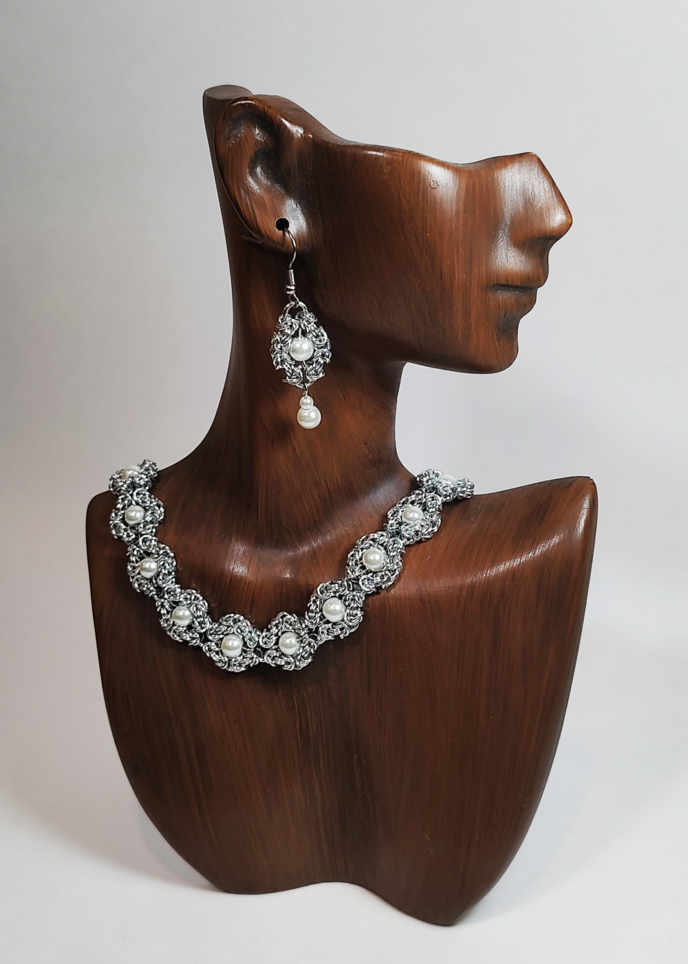 This three piece handmade chainmaille jewelry set is woven using the Romanov weave. Made using silver anodized aluminum it will never tarnish and is incredibly lightweight as aluminum is much lighter than steel. The beads are a beautiful faux pearl.