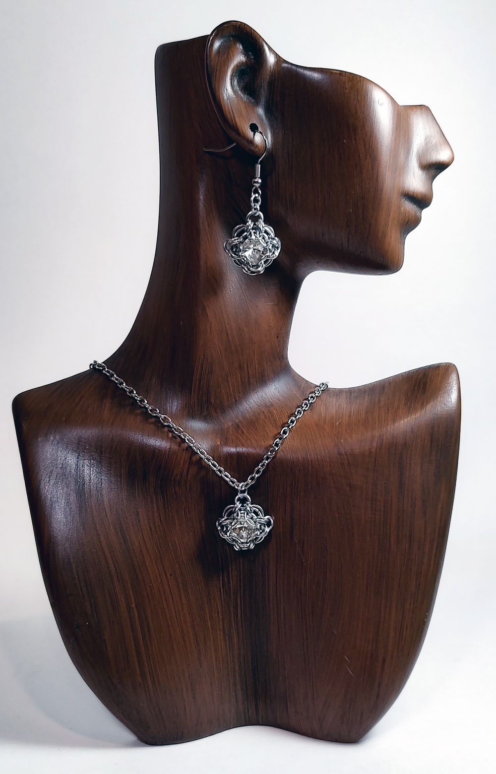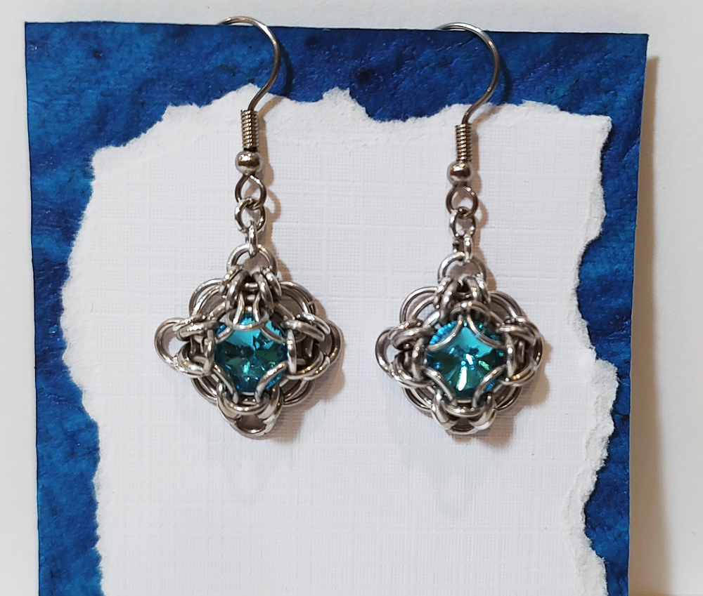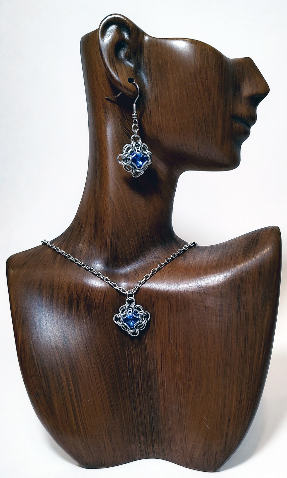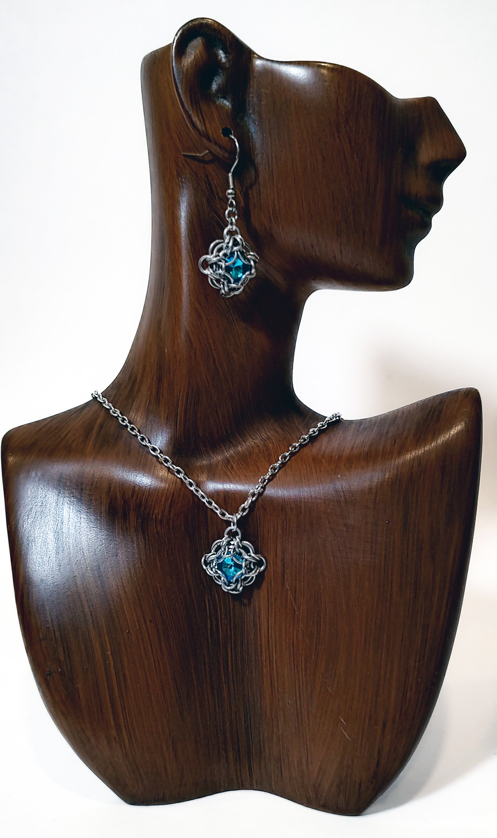 These pretty pendants and earrings are handmade using aluminum. There's so many different rings sizes in this weave, but it makes a beautiful piece so it was worth learning. There are several colors to choose from. White, pale pink, pale lavender, light blue, blue, red, multicolor pink/green/yellow.